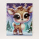 A sweet little reindeer sparkles under a snowy night sky, surrounded by frosted evergreens and twinkling lights. Her gentle expression and soft, glowing colors capture the pure innocence and warmth of the holiday season. A dreamy and heartwarming Christmas scene!