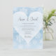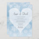 Un faire-part de mariage hivernal. Un arrière - plan bleu glacé, délicat, aux flocons de neige complexes et un coeur blanc qui symbolise la chaleur de votre amour au milieu de la beauté froide de l'hiver. Parfait pour les fêtes de saison ou les mariages de destination à un chalet de ski.