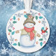 Cet ornement de Fêtes a un bonhomme de neige heureux tout habillé dans son chapeau haut, foulard d'hiver, veste et mitaines. Avec un grand sourire sur le visage, il regarde un petit oiseau cardinal rouge qui est perché dans une feuille bleue et une couronne de baies rouges. Le dos de l'ornement tient votre texte personnalisé dans cinq champs faciles à modifier. Adorable pour n'importe quel enfant !