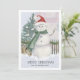 Traditionelle Weihnachtskartenszene mit einem Aquarellschneemann mit Weihnachtsmannmütze und grünem Schal. Kiefernbäume, Feuerholz und ein Zaun runden das Urlaubsgeschehen ab. Frohe Weihnachten ist unten in einem eleganten Serif-Schriftart geschrieben. Eine zweite Zeile benutzerdefinierten Textes lasse Ihnen, Ihren Namen oder eine andere Stimmung hinzuzufügen.