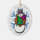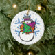 Dieses Weihnachtsschmuck zeigt einen Schneemann, der einen kleinen Weihnachtsbaum auf einem Schneeflockenhintergrund hält.