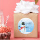 Schneemann-Aufkleber mit niedlichem Schneemann mit rotem Schal und schwarzem Hut auf verblasstem blauen Hintergrund, der die Wintersaison genießen kann, wenn Schneeflocken unterschiedlicher Form behalten werden. Ideal für Weihnachten oder andere Gelegenheiten. © Morning 6