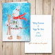 Die Vorderseite dieser Weihnachtskarte hat ein Aquarellbild eines niedlichen Schneemanns, der in einem Winterpulli, Hut und Schal gekleidet ist. Er hält seine Skier und Skistöcke und wird auf einem abstrakten, hellblauen Schnee und Sternhintergrund platziert. Innerhalb der Karte befinden sich Textfelder, die Sie nach Belieben anpassen können.