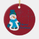 Un doux bonhomme de neige en casquette bleu, foulard et mitaines. Un arrière - plan rouge le fait vraiment ressortir. Des joues cardiaques et un nez de carotte. Jolies flocons de neige aussi.