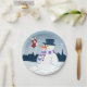 Snowmanillustration in einer Weihnachtsszene mit seinem eigenen persönlichen Strumpf, der verdübelt wird und von einer waschenden Linie gehangen ist.