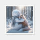 Ein Schneemann begrüßt einen schneebedeckten Fuchs, der von einem ruhigen Winterwald umgeben ist