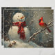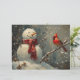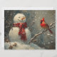 Ein herzliches Ölgemälde mit einem fröhlichen Schneemann und einem strahlend roten Kardinal, das den gemütlichen Zauber der Winterzeit einfängt.