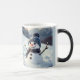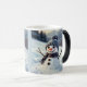 Ein fröhlicher Schneemann mit Karottennase und Kohlaugen steht in einer schneebedeckten Landschaft. Es trägt einen gemütlichen Strick-Hut und Schal, während leichte Schneeflocken sanft herumfallen.