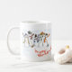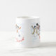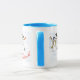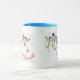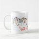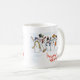 Une tasse blanche avec une jante et une poignée bleu poudre et cinq bonbons de neige sur l'avant et l'arrière, d'une aquarelle peinte à la main par Judy Adamson. Ce design est également disponible en tant que carte de Noël.
