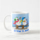 Zwei snowkids gehen sledding mit ihrem gelben Labrador-Welpen. Liest: "Schnee ist mehr Spaß mit Freunden!"