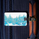 Ein stilisiertes, blaues Monotonbild von Koniferenbäumen, die mit Schnee bedeckt sind. Fügen Sie Ihre Kontaktinformationen auf der Rückseite ein. Auf der Vorderseite können Sie auch ein bisschen Text hinzufügen