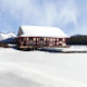 Das Maligne Lake Boat House ist schneebedeckt. Umgeben von unberührtem frischem Schnee. Hinter den Booten beherbergen die Leah Peak und Samson Peak. Der See ist voll verschneit.