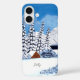 Ein Iphone 16 Gehäuse mit einer schönen Winterlandschaft inklusive schneebedeckten Bergen, rustikaler Kabine und schneebedeckten Evergreens. Text kann personalisiert oder weggelassen werden. Original-Kunstwerk von W.B.