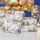 Dieses Weihnachtsverpackungspapier bietet schneebedeckte Blockhütten und rote A-Rahmen-Kabinen mit Reh und Rentieren im Schnee.