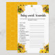 Das Thema der niedlichen gelben Hummeln umfasst eine niedliche, gelbe Hummel, eine Wortkarte für die Babydusche. Die Wörter auf dieser Karte sind alle mit Babys verwandt und wurden verdreht. Die Gäste werden sich darum bemühen, zu sehen, wer sie alle zuerst entwirren kann! ANTWORTSCHLÜSSEL: 1. Kindersitz; 2. Milch 3. Laufstall 4. Schnuller Das fünfte Element ist ein Windelrocksessel. 7. Kinderzimmer 8. Babymonitor; 9. Schluckauf 10. Formel. 11. Gummiklemme 12. Rolle. 13. Überwachung. 14. Verbindung 15. Thermometer.