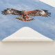 Ein anmutiger roter Drachen in der Flucht gegen einen bewölkten Sommerhimmel. Anpassen durch Hinzufügen Ihres eigenen Textes Der rote Drachen (Milvus milvus) wurde vom nationalen Aussterben in Großbritannien gerettet und wurde wieder in England und Schottland eingeführt.