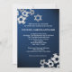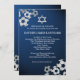 Ballons de football multisports thème bar mitzvah invitation en bleu avec audacieux texte propre éditable et argent Star of David. Boules de football en argent dans les coins supérieurs et inférieurs de cette élégante invitation de sport de football mitzvah.