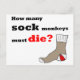 Rufen Sie alle Aktivisten der Socken-Affe an. Es ist an der Zeit, die Socken zu vergießen und das Wort über das Großschlachten von Affen zu verbreiten. Dieses clevere Postkartendesign zeigt ein handgezeichnetes Bild eines braunen und roten Sockels und die Beschriftung "Wie viele Affen müssen die werden?" Dies ist die perfekte Postkarte, um das Bewusstsein für Socken-Affen zu erhöhen.