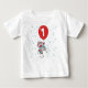 Erster Geburtstag niedlicher Sockenaffe in Rot und Türkis hängt an einem roten Ballon mit großer Zahl 1.