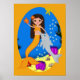 Sofia ist eine magische und zauberhafte Wasserkreatur, die als Meerjungfrau bekannt ist. Ihr dunkelbraunes Haar ist mit einer orangefarbenen Blume geschmückt. Sie hat einen Orangenhain, einen Orangen-Schwanz und Flossen, und einen orangefarbenen Perlgürtel. Sofia, die Meerjungfrau, streichelt ihren Delfinfreund und hält eine orange Blume, während sie in der Nähe des goldenen Sandbodens spielen, der mit grünen Algen-Pflanze, roten Korallen, lila Seeigeln, die Blasen blasen, und schönen Muscheln aus weiß-braunen Streifen dekoriert ist.