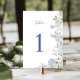 Romantische und zarte weiche blaue Aquarellblume Tischnummer mit handgeschriebenem Skript.