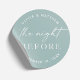 Fügen Sie Ihrem Hochzeitsessen eine ruhige und elegante Touch mit diesem zartrosa grünen Rundaufkleber mit "The Night Before" hinzu. Ideal für Paare, die in sanften, modernen Farbtönen Liebe haben. Mit seinem klassischen, minimalistischen Design ist dieser Aufkleber ideal zum Abdichten von Umschlägen, Dekorieren von Geschenktaschen oder zum Personalisieren von Geschenken für Ihre Hochzeitsfeier. Der dumpfe blaue grüne Ton verbindet sich wunderbar mit einer Vielzahl von Hochzeitsthemen, wie z.B. formale, nautische, küstennahe oder Herbstfeiern.