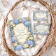 A refined dusty blue hydrangea design framed in an elegant baroque-inspired composition. Voluminous hydrangea clusters in soft powder and periwinkle tones are paired with creamy ivory florals and muted sage greenery, creating a balanced, symmetrical garden frame. The warm parchment-style background adds a subtle antique touch while keeping the overall look airy and sophisticated. Ideal for a timeless celebration with a romantic, elevated aesthetic.