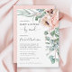 Eine wunderschöne feminine Babydusche mit einem Eckbouquet aus Aquarellmohn, Rose, Eukalyptus und dem anschließenden Grün in Pastellbeige, Rosa, Grün und Blau-Grün. Zu den modischen Gesichtspairings zählen handgeschriebene Skripte und elegante Serifen. Diese Einladung ist eine großartige Wahl, wenn es darum geht, Mutter zu ehren, die weit weg lebt, oder wenn es nicht möglich ist, sich persönlich zu treffen. Personalisieren Sie die leicht zu bedienende Textvorlage mit Ihren Ereignisdetails.