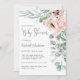 Eine wunderschöne feminine Babydusche mit einem Eckbouquet aus Aquarellmohn, Rose, Eukalyptus und dem anschließenden Grün in Pastellbeige, Rosa, Grün und Blau. Zu den modischen Gesichtspairings zählen handgeschriebene Skripte und elegante Serifen. Diese Einladung ist eine großartige Wahl für die zukünftige Mutter, die ein kleines Mädchen erwartet. Personalisieren Sie die leicht zu bedienende Textvorlage mit Ihren Ereignisdetails.