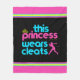 Softball-Fleecedecke des Mädchens mit dem Text, "diese Prinzessin Wears Cleats" in rosa, in Blauem und Gelb über einem dunklen Hintergrund.