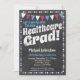 Une invitation amusante et unique à la fête de remise de diplômes de soins de santé dans le style tableau de bord avec des drapeaux rouges, blancs et bleus et une bordure en pois blanc avec des points à l'arrière.