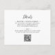 Soirée Eucalyptus Réception Mariage White Invitation... Notre unique invitation à la réception "avant et arrière", de taille carte postale, est composée de feuilles d'eucalyptus émeraude qui bordent votre texte d'information de réception sur un arrière - plan blanc immaculé. La calligraphie chic associée au serif noir et le texte italique expressif créent un look simple classique et élégant pour votre invitation à la réception. Le verso de l'invitation contient votre code QR du site Web mariage ainsi que l'URL du site Web écrit dans le texte afin que vos invités puissent RSVP facilement en ligne et aussi voir les détails qu'ils ont besoin de connaître, y compris les options de repas, les hébergements disponibles, et les sites de registre des cadeaux. Tous les exemples de texte peuvent être facilement remplacés par vos propres informations sur le modèle de personnalisation. Des enveloppes pour cette invitation de format carte postale peuvent être achetées sur la même page.