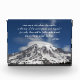 Akryllischer Foto-Block, der das Foto einer Wolke über schneebedeckten Berg Rainier zeigt, zusammen mit einem philosophischen Zitat des Historikers Sokrates.
