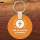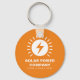 Solar power keychain with custom business name. Custom key chain template design for solar power panel installer or electrical specialist. Modern sun light with bolt icon logo. Add your own personalized slogan and company name. Renewable energy logo.