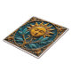 Vintage geschnitzte Fliesen mit einer schlafenden Sonne mit einem menschlichen Gesicht, umgeben von Blätter und Blumenschmuck, alles in einer quadratischen Fliese mit verziertem Rahmen, aquamariner Hintergrund.