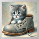 Dieses Kunstwerk zeigt eine herzzerwärmende Szene eines flauschigen, grauen Kätzchens, das in einen abgenutzten Lederschuh eingebettet ist. Die großen blauen Augen des Kätzchens scheinen einen Hauch von Neugier und vielleicht eine Touch von Einsamkeit zu tragen. Der Kontrast zwischen dem winzigen Kätzchen und dem großen Schuh schafft ein Gefühl des Staunens und trägt zum Charme des Bildes bei.