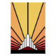Un motif de style art déco classique aux couleurs de l'aube. Un motif emblématique du soleil se levant derrière un bâtiment en forme d'art déco stylisé. Un design simple mais élégant, fidèle à l'époque.