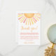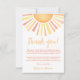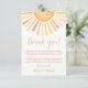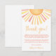 Cette carte de remerciement au thème solaire, lumineuse et joyeuse, est un moyen parfait d'exprimer votre gratitude après votre célébration. En haut, un grand soleil avec des rayons vibrants de nuances jaunes, orange et une touche de rouge ajoute une touche chaleureuse et joyeuse.