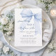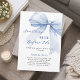 Ein eleganter weißer Hintergrund, mit blauem Bogen dekoriert. Personalisieren und fügen Sie einen Namen und Party-Details hinzu. Text: Etwas Blau bevor ich es tue.