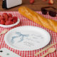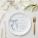 Elegant paper plates for her bridal shower featuring a vintage Grandmillenial- inspired blue coquette bow watercolor, "something blue before I do" in a chic blue calligraphy script, and the bride's name and shower date in classic serif typography.