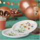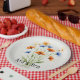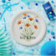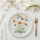 Eine zarte Aquarellmalerei mit lebhaften orangen und weichen blauen Wildblumen. Die blumengeschmückte Anordnung zeigt aufwändige Pinselstriche und verbindet warme und coole Farbtöne für eine harmonische, naturlich inspirierte Komposition. Ideal für botanische Kunstliebhaber und Hochzeiten.