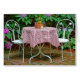 Altmodischer Eistisch und Stuhl im Garten von Rhododendron.