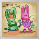 Ein niedlicher, knuspriger rosa Hase hat den kleinen grünen Hasen bis zum Kinn begraben, während sie im Sand spielen. Originelles Design von Christie Black von Kreationen aus dem Herzen.