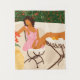 Eine entspannte Figur in einem rosa Kleidersessel auf einem sonnigen Innenhof, umgeben von üppiger Vegetation und lebhaften Blumen. Dieses Kunstwerk spiegelt die Wärme und Ruhe eines mediterranen Sommernachmittags wider.