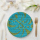 Worte, die gemeinen Sommer: Tropische Brisen, Cool Blau und Tequila Sonnenaufgang kombiniert mit Bildern von Monstera Blätter, Palmen Bäume, Hibiskus und erstellen Sie diese grafische Gestaltung. Die Papierservietten koordinieren sich mit den Tellern in den umgekehrten Farbpositionen.