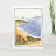 This fun watercolor is of a beach scene with its row boat and lighthouse in the background with relief boats sailing the blue sea.