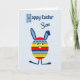 Ein niedlicher Osterhase für Ihren Sohn in Form eines Ostereis. Das Ei ist mit Streifen, Zickzacken und Flecken in Gelb, Rot und Blau dekoriert, der Hintergrund ist hellblau. Im Inneren lautet der Gruß: "Ein glücklicher Osterhasen ist hier, um einem ganz besonderen Sohn ein sehr glückliches Ostern zu wünschen!" oder das kann auf Ihre Bedürfnisse zugeschnitten werden.