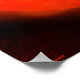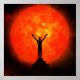 Ein Mann, stehend auf dem Gipfel eines Berges, hebt seine Arme, seine Silhouette gesehen gegen eine riesige, leuchtend orange und rote Sonne.