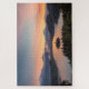 Puzzle mit einem bunten Sonnenaufgang über See blutete mit der Insel mit Kirche und Alpen moutnains im Hintergrund am frühen Morgen in Slowenien.