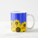 Viele Sonnenblumen vor blauem Hintergrund. Die Sonnenblumen zeigen ihre Liebe mit Herzen in ihrer Mitte.